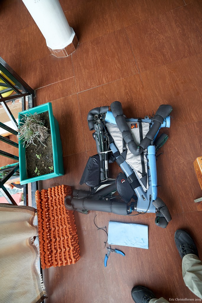 While the Tranny’s frame is very light, reputed to be 3.5 pounds, the additional components, heavy tires and endless bags meant my bike was nearly 28 pounds loaded with bags and heavy tires.