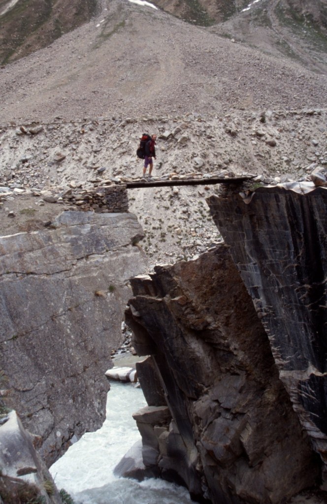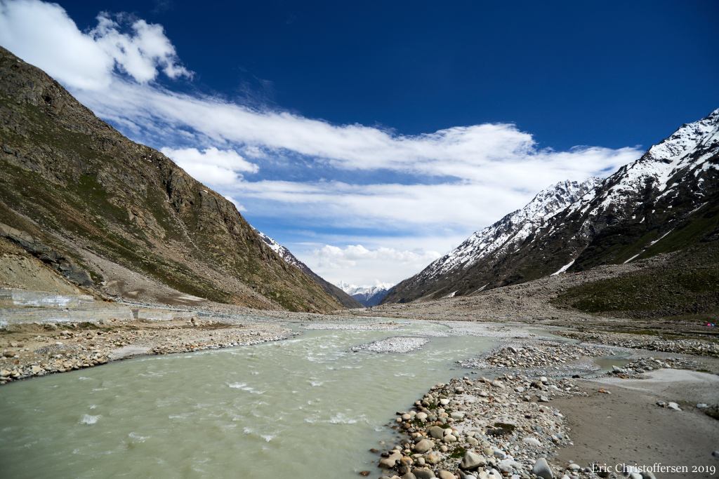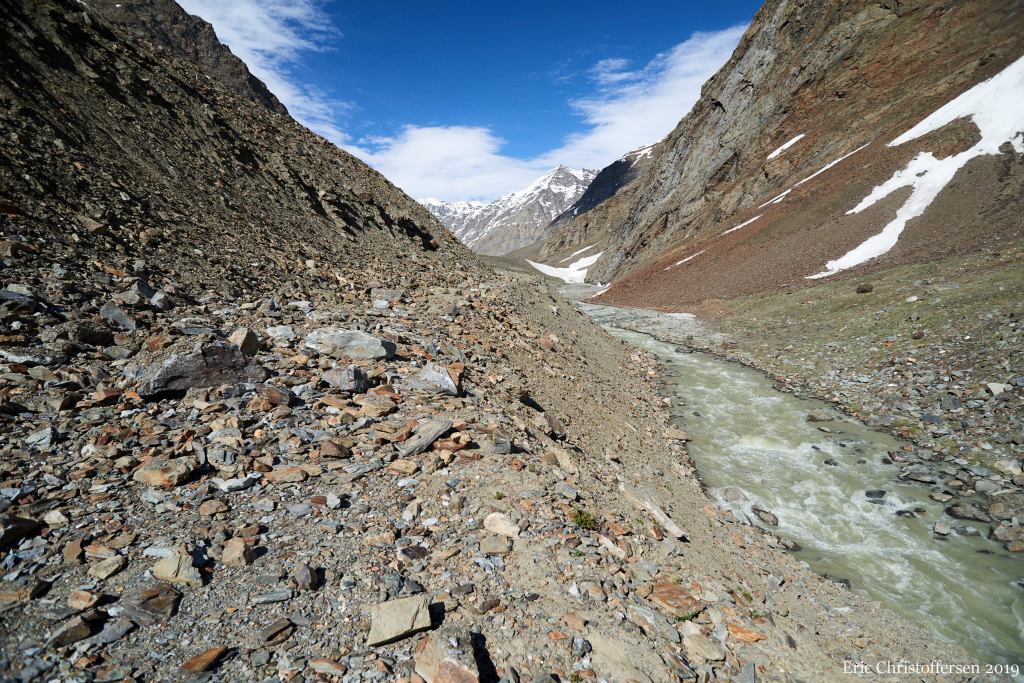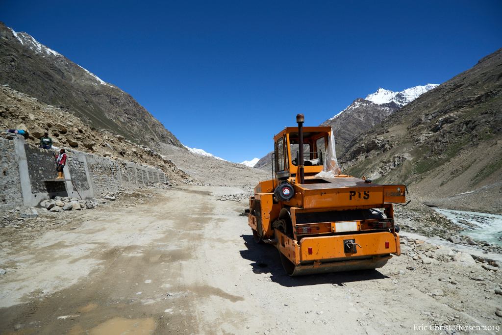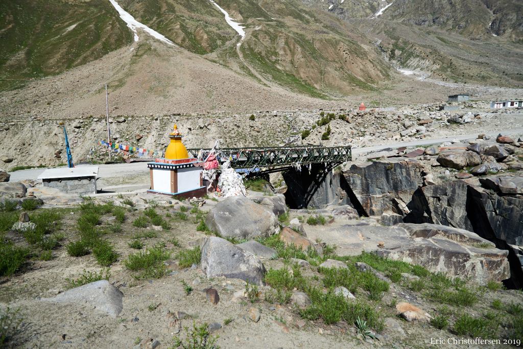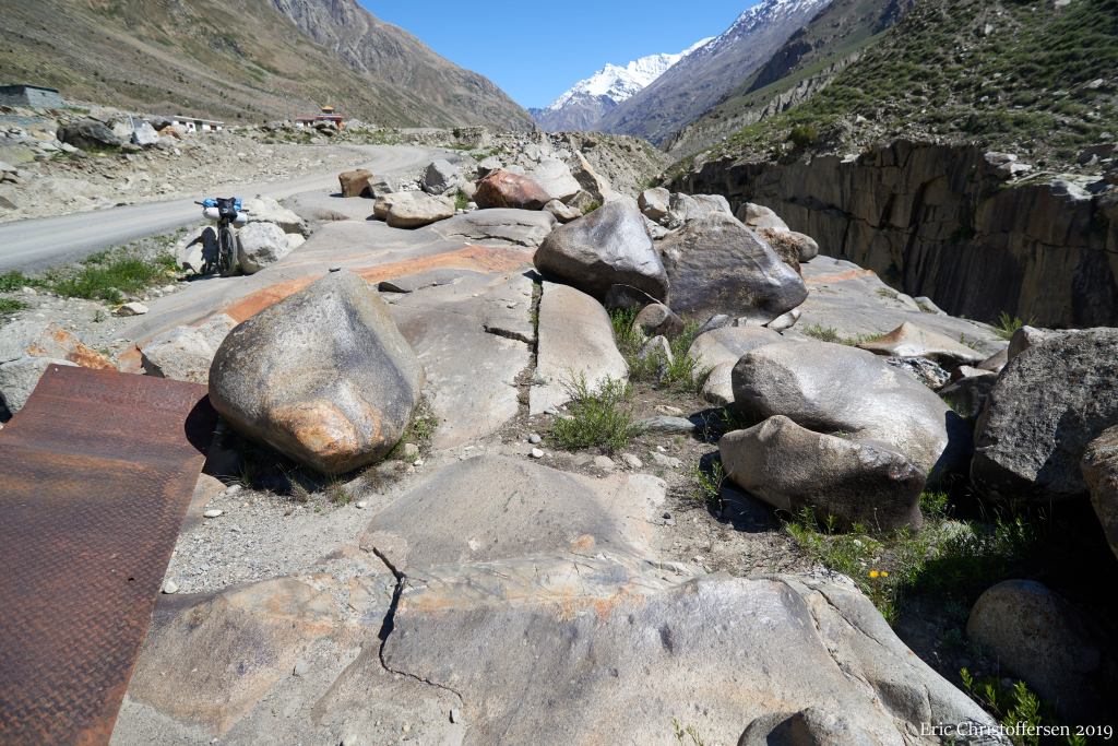 There is a new vehicle bridge at Zanskar Sumdo to cross the Barai. The old tea stall was a big tent at the base of the moraine, but now a new more permanent looking tea stall is sighted just before the bridge, and I’m surprised to find there’s a large tent camp here, with modern lightweight western-looking tents. I cruise into this tent town hoping the tea stall is open and instead find myself greeted by a college mountaineering team. They were the ones in the trucks 2 days ago. They have an enormous pile of gear. “What are you doing here?” I ask.