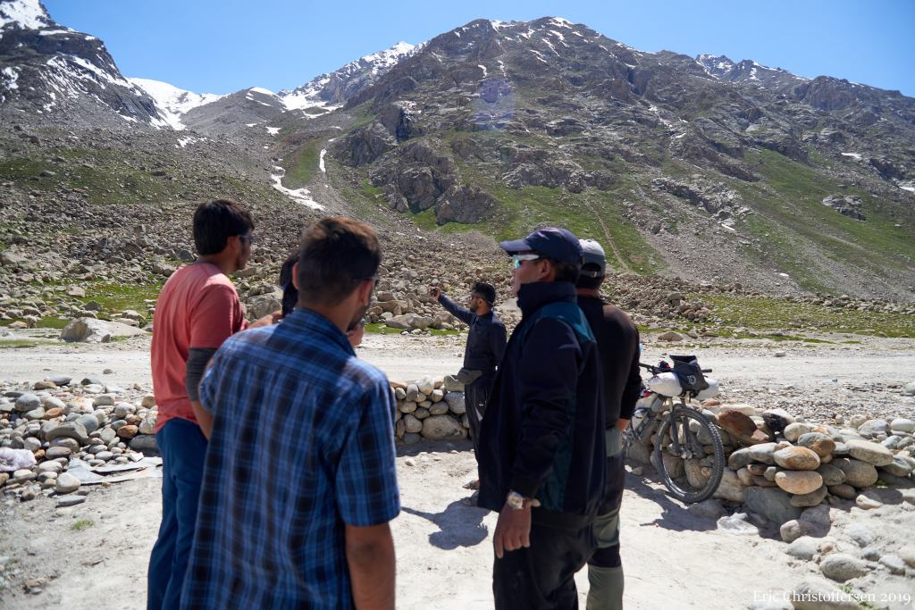 Well… they had hired trucks to take them and their gear to Chumi Napo, a campsite way up near the pass. But the road isn’t passable. So now they’re trying to find some way to move all their stuff up the valley? They have spent the day scouring the valley for help but noone is available. No horses, etc.