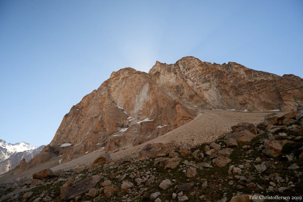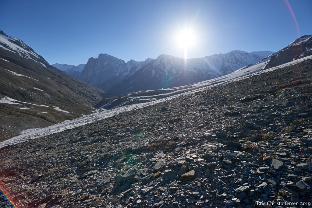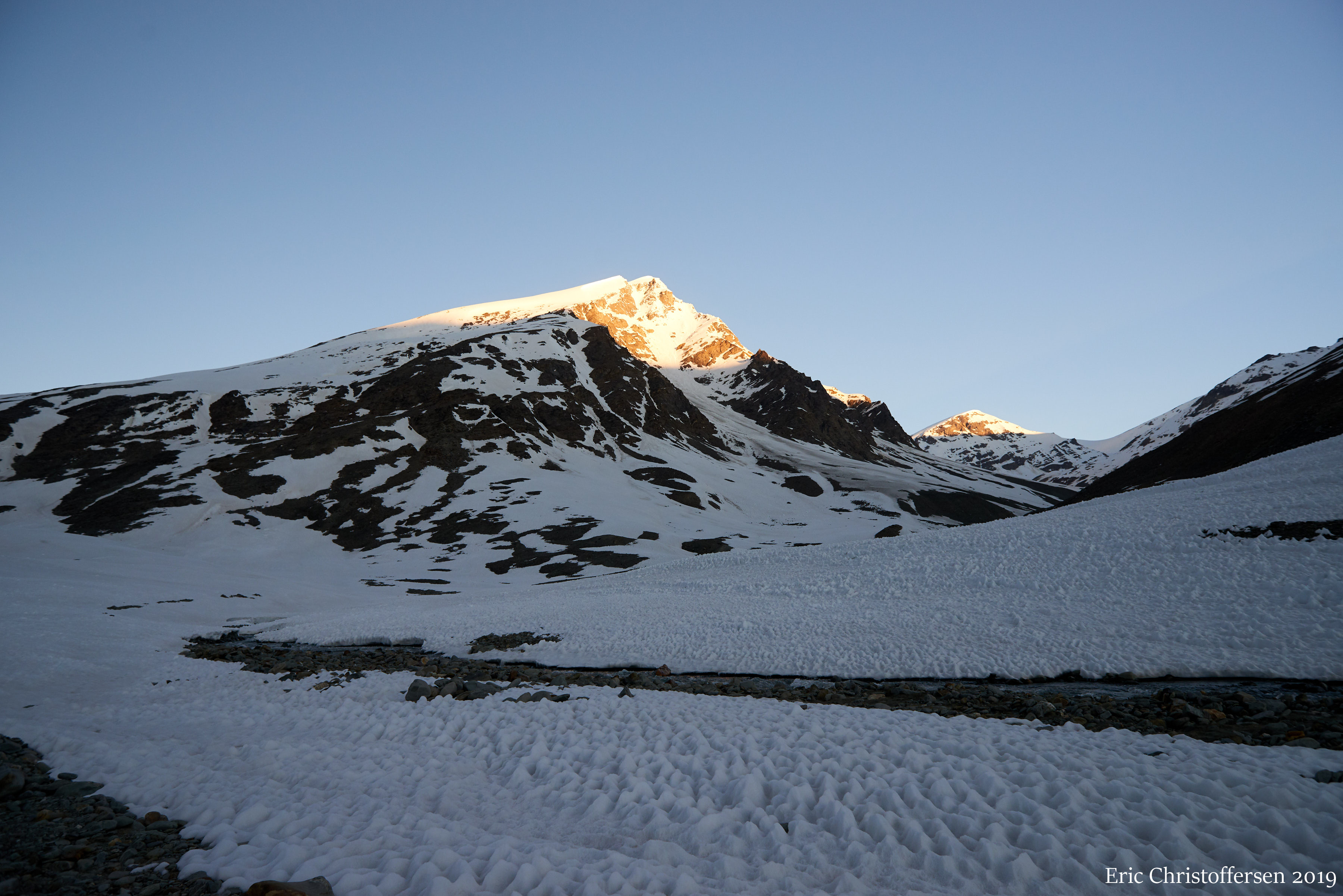 Wake at 4:30am, sun nowhere, but at 5am there is sun on the peaks above the pass. Glad to see the waterbottles are partially frozen, snow will be hard and easy to walk upon. Shoes are frozen.