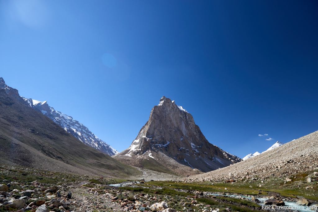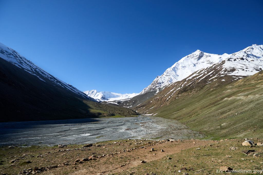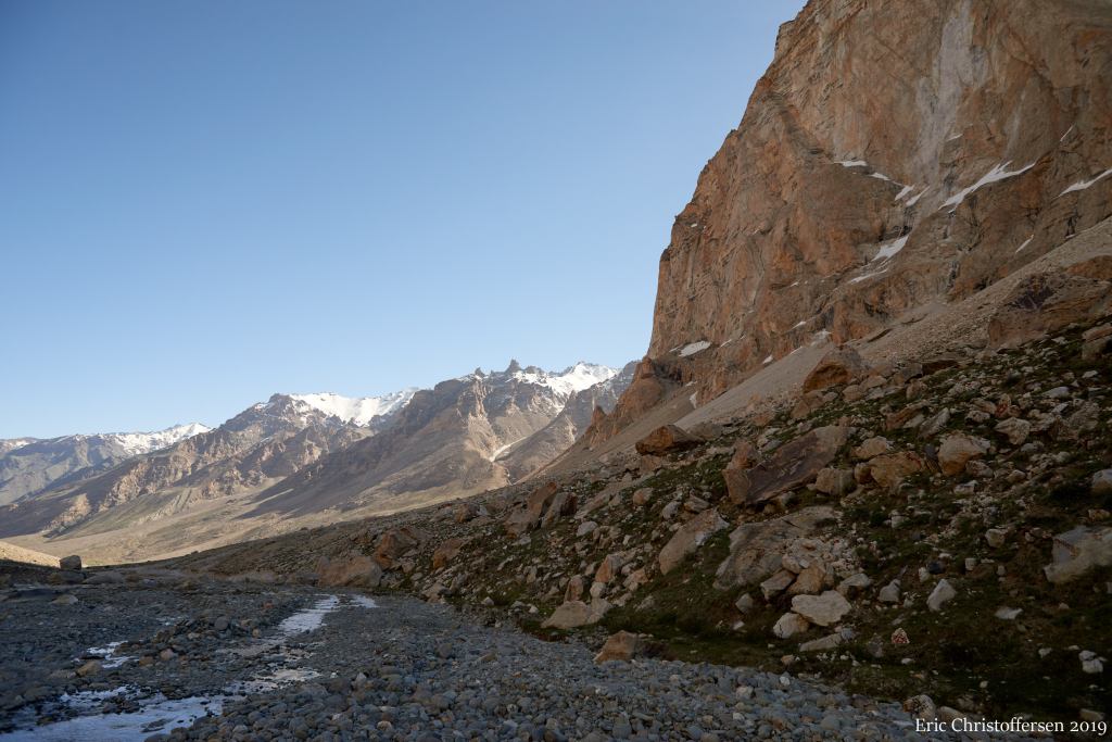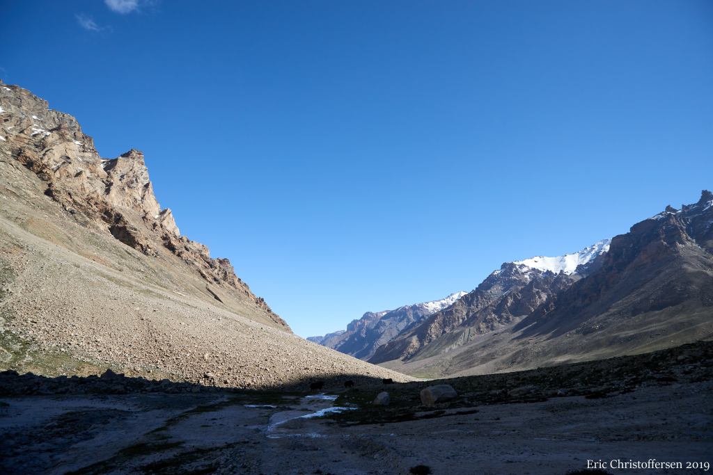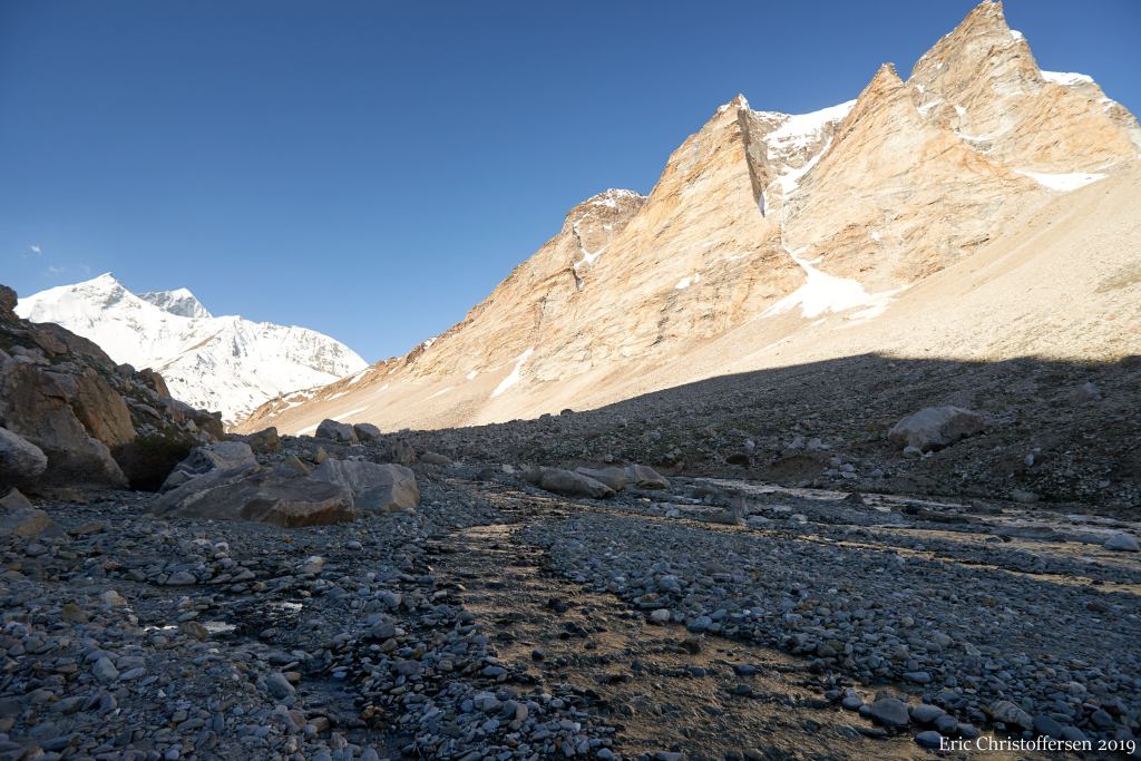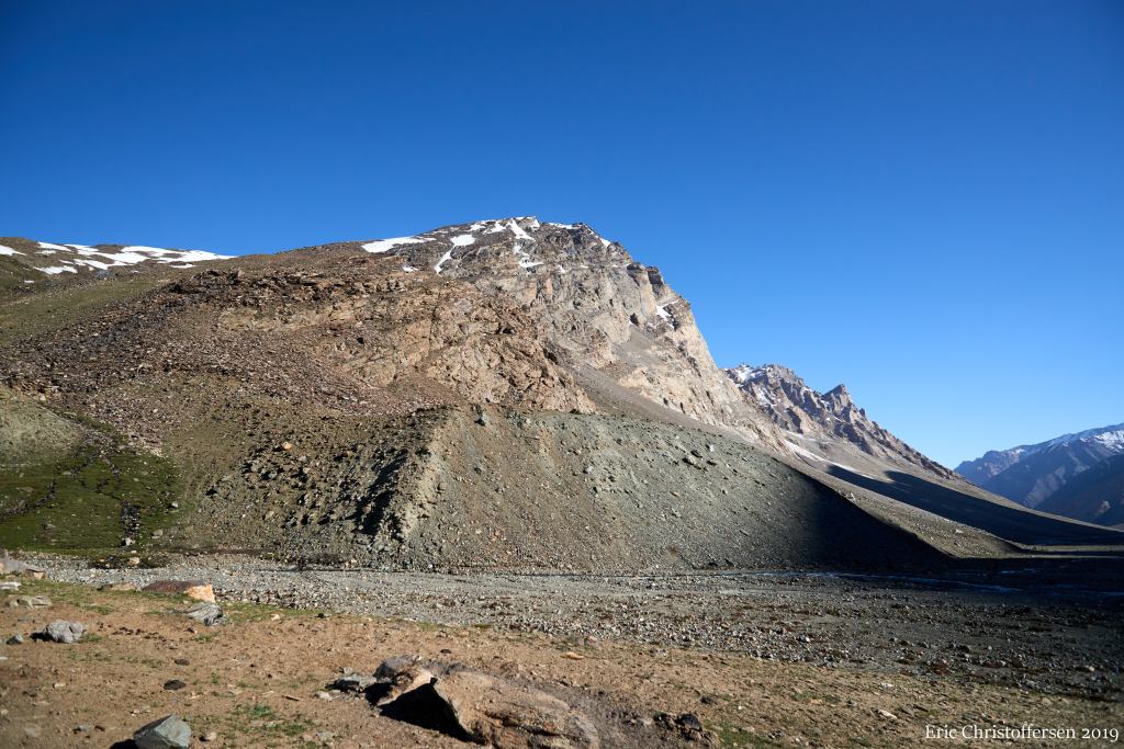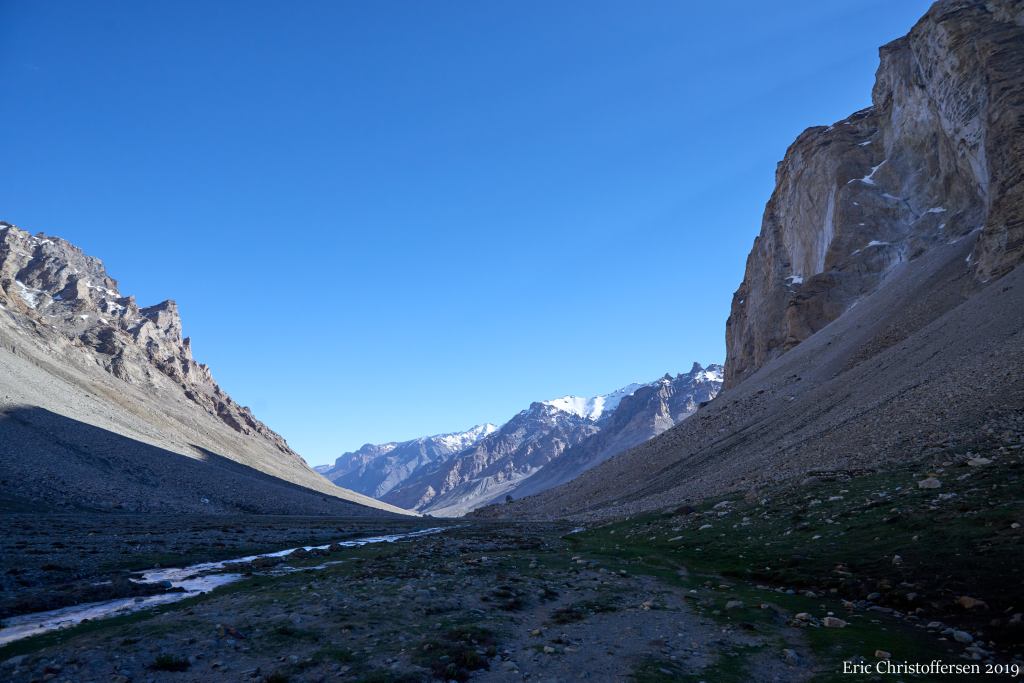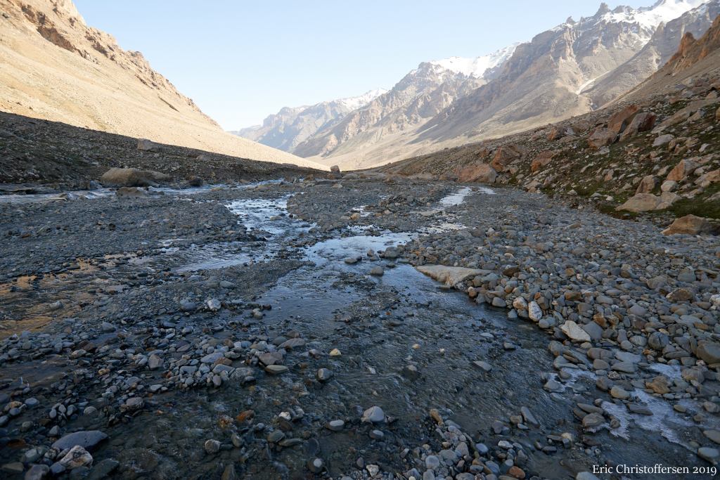 Looking up Kurgiakh-Chu towards the huge glacier at the head of the valley. Other side of that mountain is Zing-Zing-Bar on the Leh Manali highway.