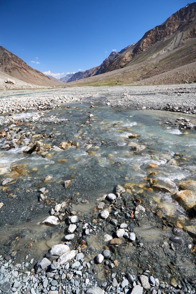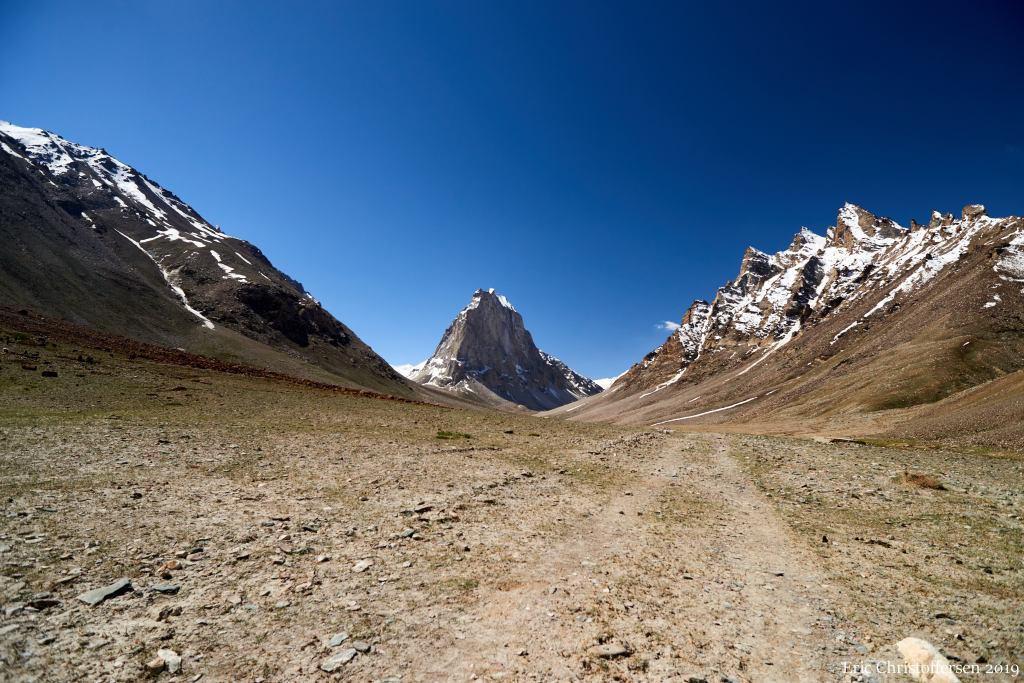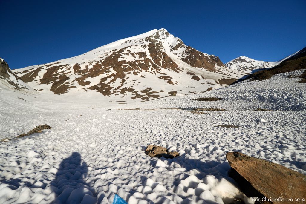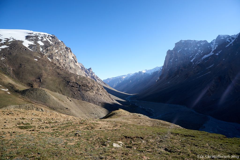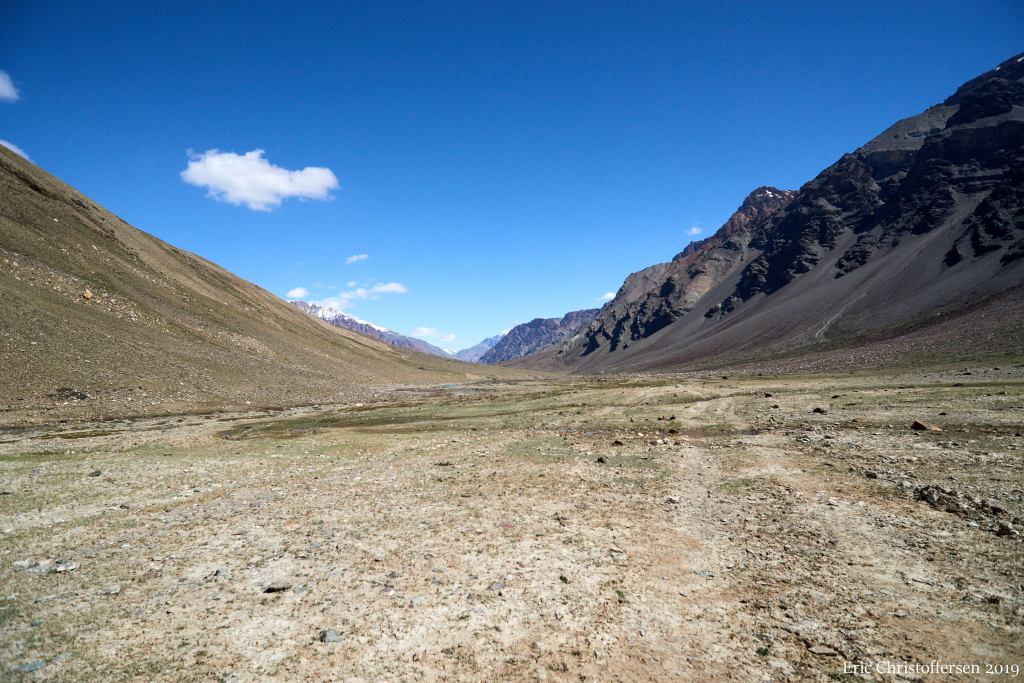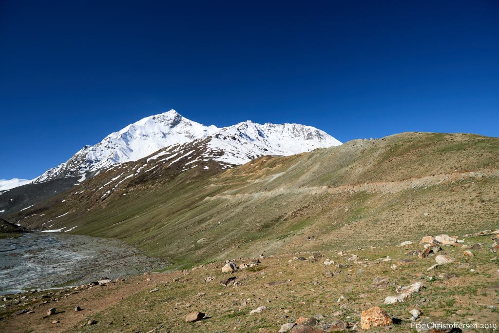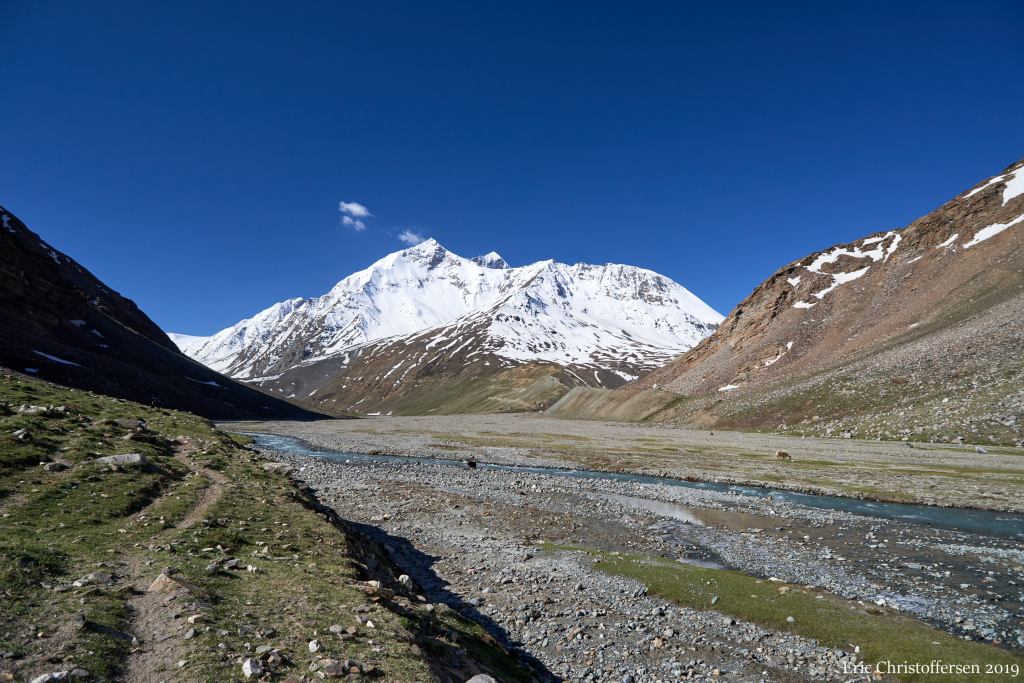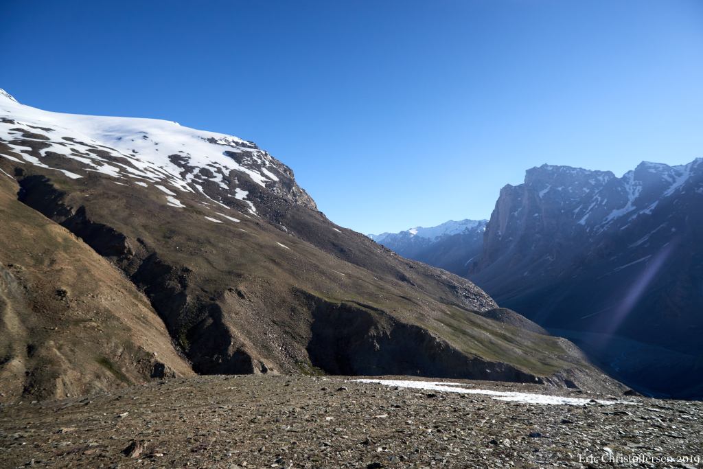 Looking up Kurgiakh-Chu towards the huge glacier at the head of the valley. Other side of that mountain is Zing-Zing-Bar on the Leh Manali highway.