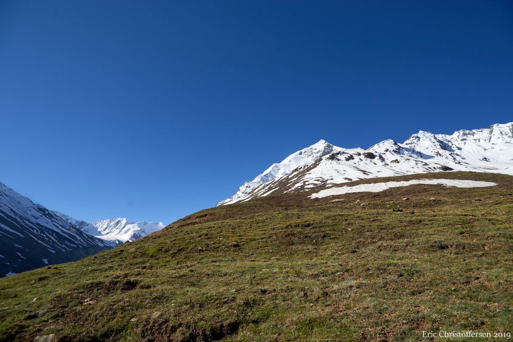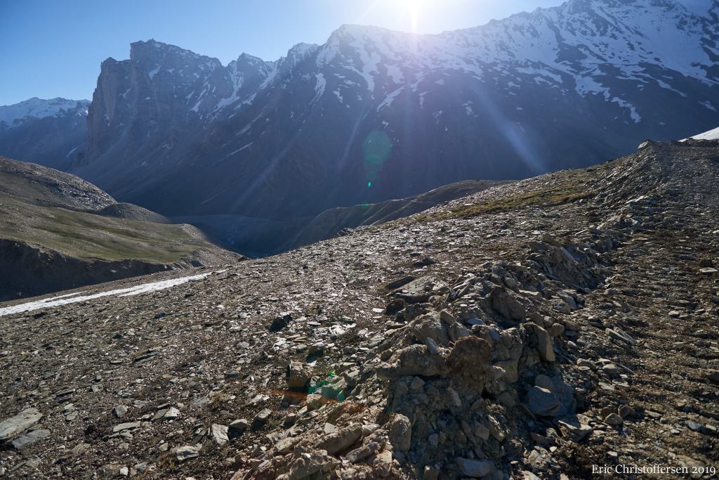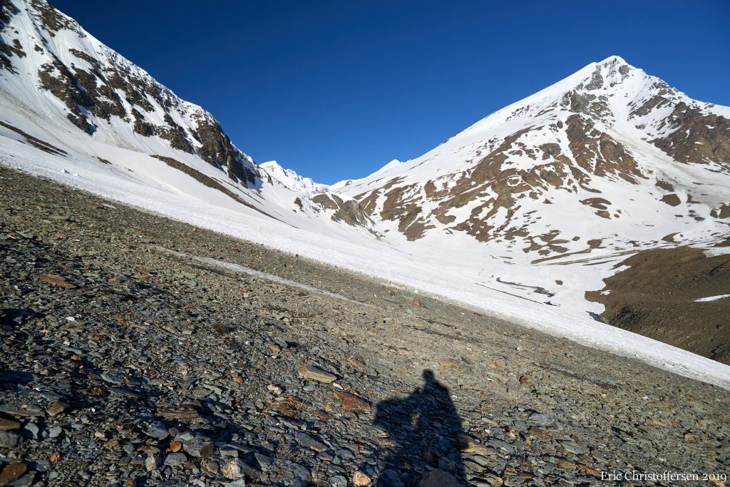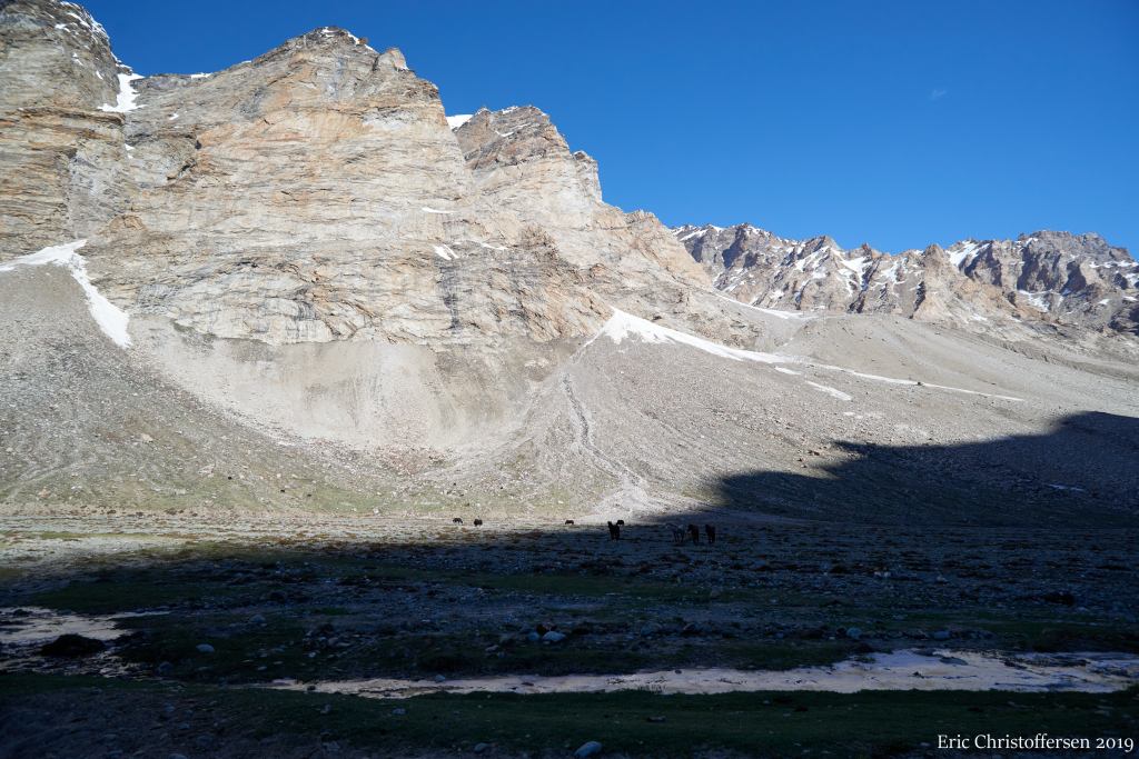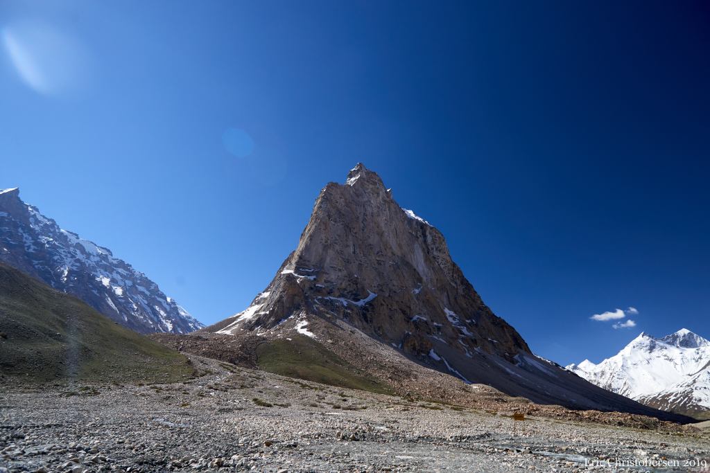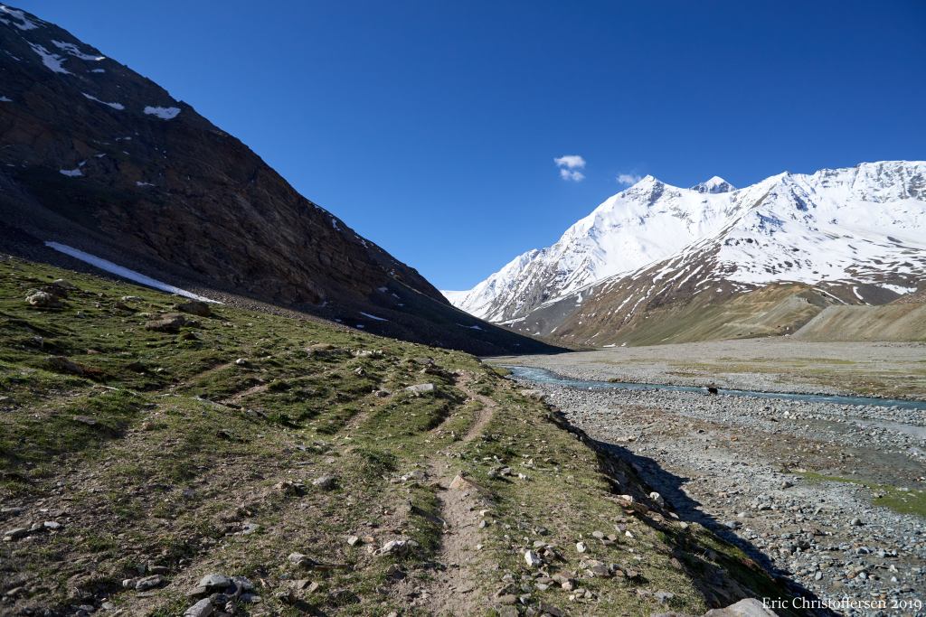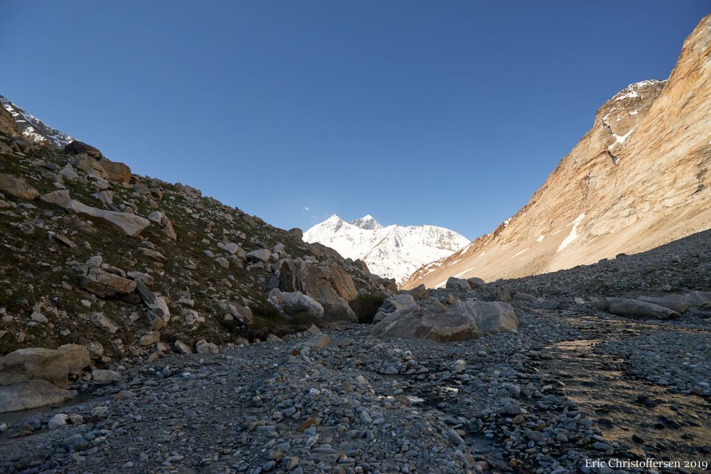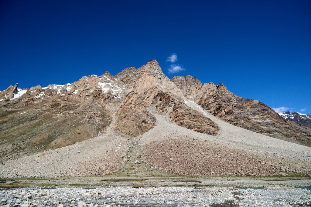 Looking up Kurgiakh-Chu towards the huge glacier at the head of the valley. Other side of that mountain is Zing-Zing-Bar on the Leh Manali highway.