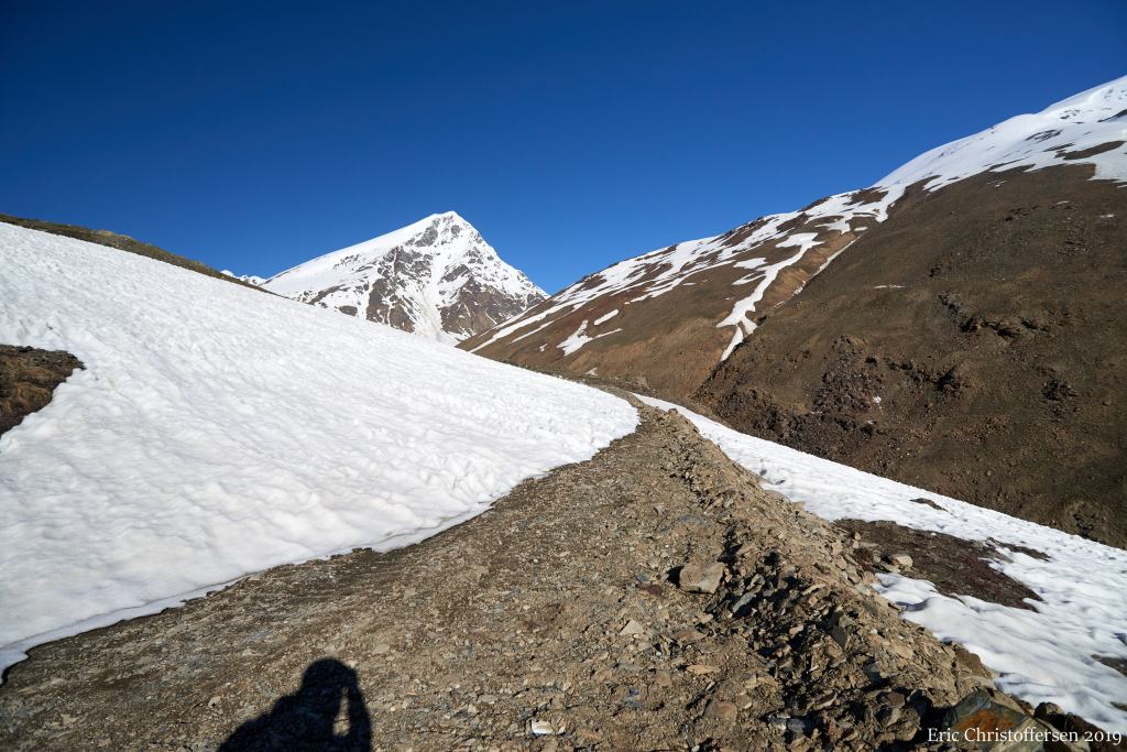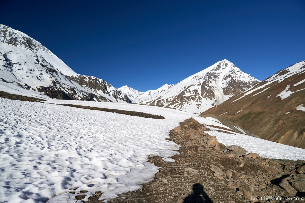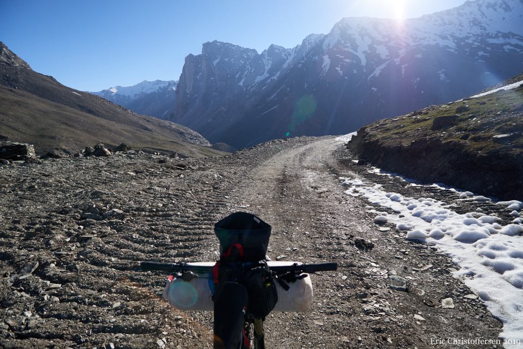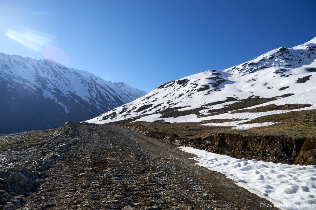 Yes, the switchbacks down to Lakong! I have been looking forward to doing some coasting for a while now, I eagerly jump onto bike, round the corner and am met with a road still full of snow!