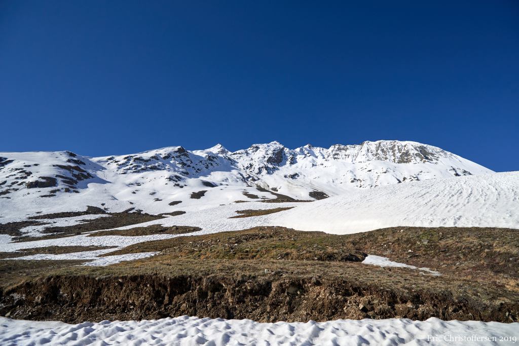 I pack quickly and head off onto the snow. I am so pleased to not be posthole’n. Road again is impassable – packed with steep snow and a slip means I’d go down a few hundred feet into a rocky creek. Instead I climb up and across a lower angle snow and rock field.